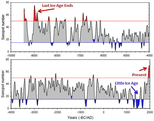 The warmest earth climate corresponds with the highest amounts of smoothed sunspot activity during periods named Grand Maxima. The coldest periods, like the “little ice age” correspond to times of low solar activity during so-called Grand Minima.